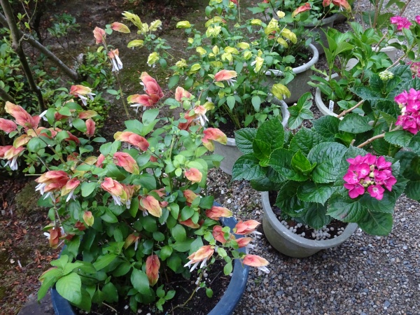 鉢植えのエビ草がにぎやかに咲いています。