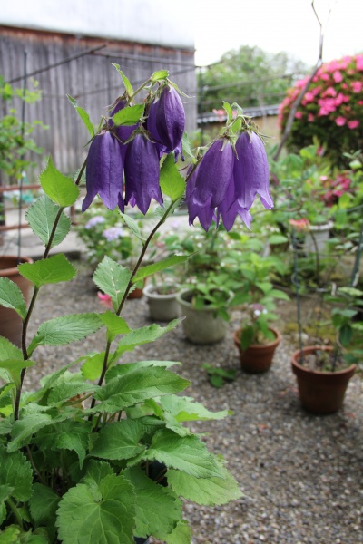 青色ホタルブクロです。鉢植え花を並べています。